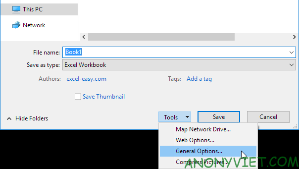 Làm thế nào để mở file Excel ở chế độ chỉ đọc mà không cần mật khẩu? Bạn chỉ cần chọn Read-only recommended trong mục General Options khi lưu file.