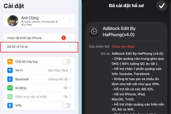 Bước 2: Vào Cài đặt > Cài đặt chung > Quản lý VPN và Thiết bị. Chọn hồ sơ Adblock Edit By HaPhung v4.0 trong mục Hồ sơ đã tải về, nhấn Cài đặt và nhập mật khẩu nếu cần.