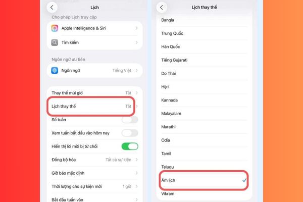 Bước 4: Chọn Âm lịch. Sau khi hoàn tất, mở ứng dụng Lịch để xem ngày âm hiện ngay bên dưới lịch dương.