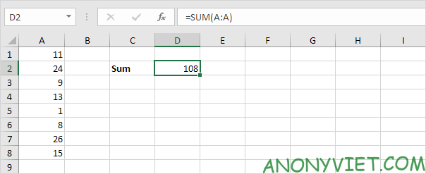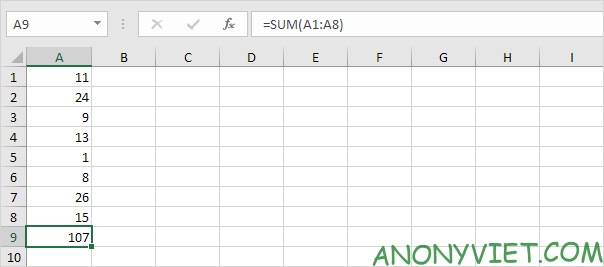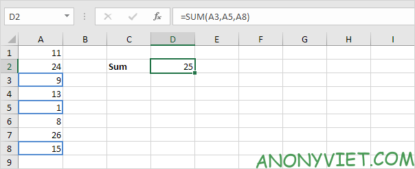 Lưu ý: công thức =A3 + A5 + A8 có thể cho kết quả tương tự.