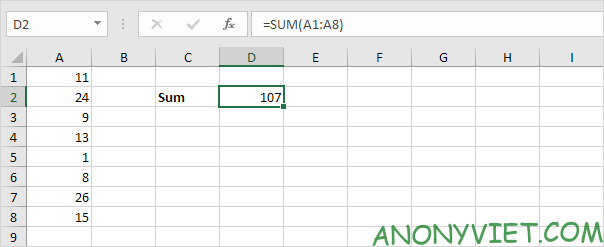 Lưu ý: công thức =A3 + A5 + A8 có thể cho kết quả tương tự.