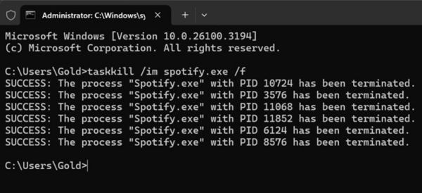 Nếu Spotify vẫn chạy ngầm, bạn có thể dùng lệnh Taskkill để tắt hoàn toàn:
