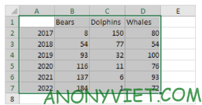 Bước 1: Chọn phạm vi dữ liệu, ví dụ A1:D7.
