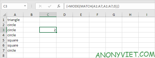 2. Kết hợp hàm MODE để xác định vị trí của từ xuất hiện nhiều nhất.