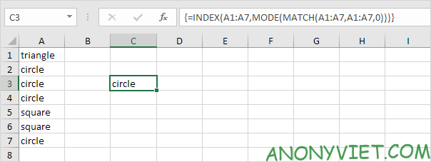 4. Cuối cùng, dùng hàm INDEX để trả về từ xuất hiện nhiều nhất trong phạm vi đã xác định.