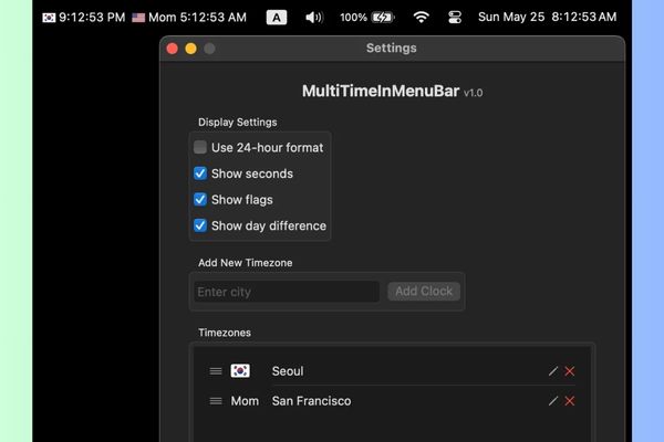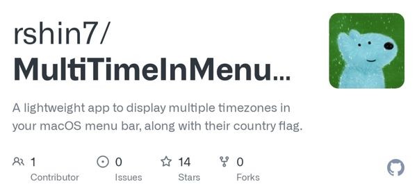 MultiTimeInMenuBar là ứng dụng mã nguồn mở nhỏ gọn, hiển thị nhiều múi giờ ngay trên thanh menu của Mac. Ứng dụng này giúp bạn dễ dàng theo dõi giờ quốc tế chỉ với một cái liếc mắt, mà không cần mở thêm cửa sổ hay ứng dụng phụ.