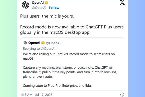 OpenAI vừa triển khai chế độ ghi âm (Record Mode) cho người dùng ChatGPT Plus trên macOS. Đây là tính năng hỗ trợ ghi chú và tóm tắt thông minh trong các cuộc họp. Bạn có thể xem thêm tại Tin tức 360.