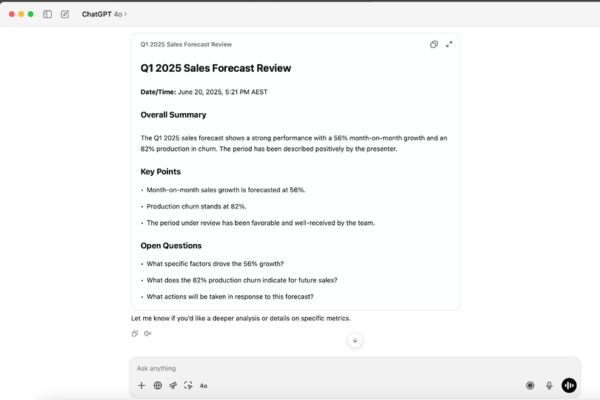 Chế độ ghi âm của ChatGPT trên macOS là công cụ hữu ích giúp tự động hóa việc ghi chú và tóm tắt cuộc họp. Với tính năng này, người dùng có thể tập trung hơn vào nội dung thảo luận mà không lo bỏ lỡ các chi tiết quan trọng.