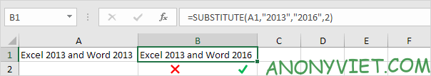 Hàm SUBSTITUTE cho phép bạn thay thế một chuỗi văn bản với một chuỗi khác. Bạn có thể chỉ định lần xuất hiện mà bạn muốn thay thế bằng cách sử dụng tham số thứ tư. Ví dụ, để thay thế ‘2013’ bằng ‘2016’, bạn sẽ sử dụng công thức tương ứng.