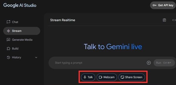 Google AI Studio cho phép bạn trò chuyện trực tiếp với AI thông qua tính năng Stream (Talk). Đây là cơ hội thực hành giao tiếp tự nhiên, phù hợp với mọi tình huống như phỏng vấn xin việc, thuyết trình hay trò chuyện đời thường.