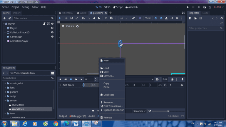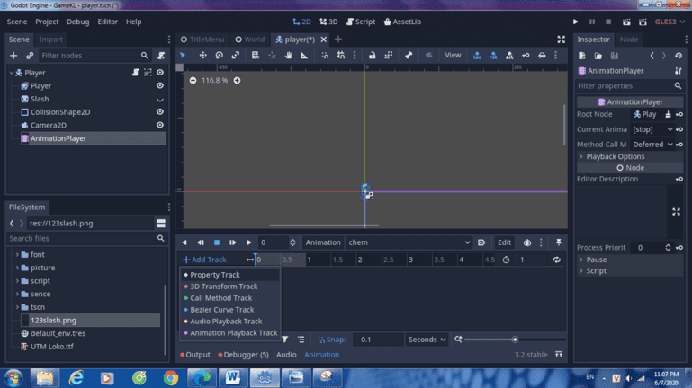 Để bắt đầu, bạn tạo một node AnimationPlayer trong scene Player. Sau đó, tạo một animation mới và đặt tên cho nó là chem.