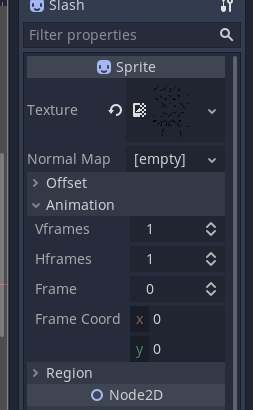 Tiếp theo, bạn cần tạo một node sprite và thêm ảnh chém vào đó. Trong bảng Inspector, bạn cần thiết lập các thông số như Vframes và Hframes để xác định số lượng frame dọc và ngang trong SpriteSheet.