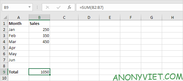 1. Chọn ô B9 và nhập hàm SUM để tính tổng đơn giản.