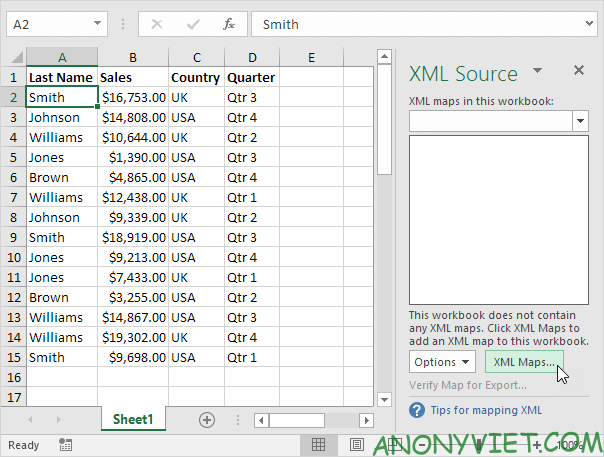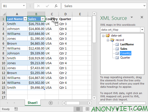 Bước 4: Kéo dữ liệu từ bảng XML vào trang tính Excel.