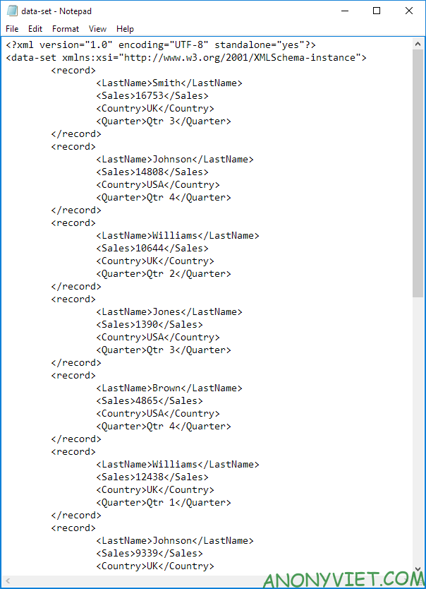 <?xml version="1.0" encoding="UTF-8" standalone="yes"?> <data-set xmlns:xsi="http://www.w3.org/2001/XMLSchema-instance"> <record> <LastName>Smith</LastName> <Sales>16753</Sales> <Country>UK</Country> <Quarter>Qtr 3</Quarter> </record> </data-set>