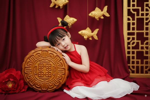 Phong cách này mang màu sắc lễ hội với tông màu đỏ và vàng chủ đạo. Bé gái sẽ được tái hiện trong trang phục váy đỏ cách điệu, tựa đầu vào bánh Trung Thu lớn, xung quanh là các chi tiết trang trí truyền thống.