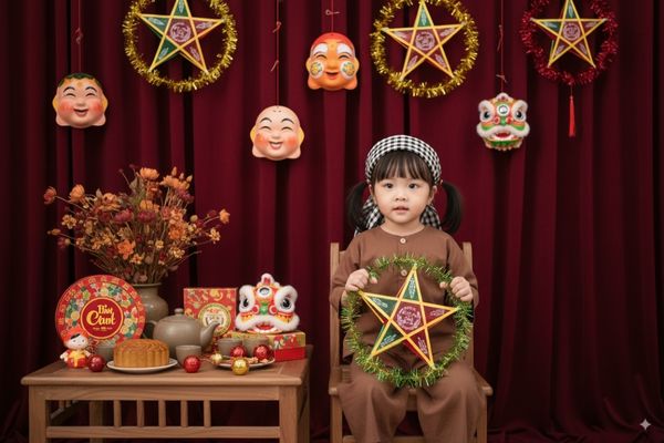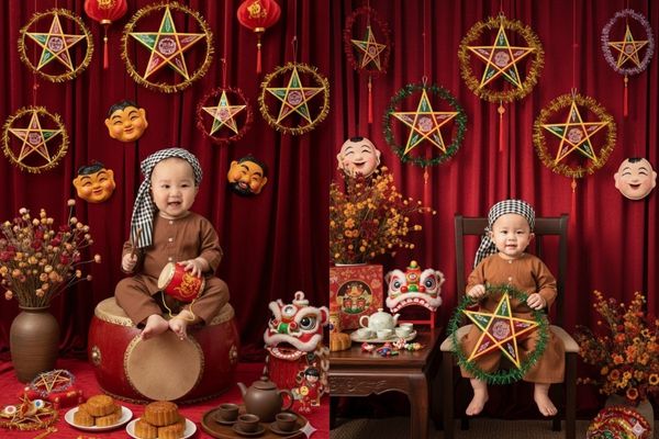 Phong cách này tái hiện không khí Trung Thu hoài cổ. Bé mặc áo bà ba, ngồi bên lồng đèn, đầu lân và các món đồ trang trí truyền thống, tạo nên bức ảnh gần gũi, ấm áp.
