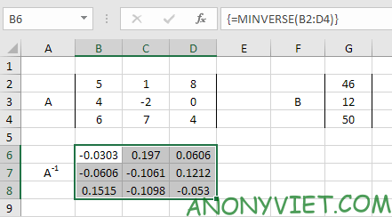- Đầu tiên, sử dụng hàm MINVERSE để tìm ma trận nghịch đảo của A.