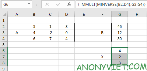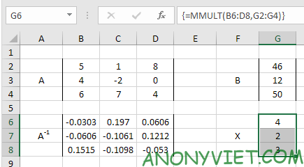 - Sau đó, sử dụng hàm MMULT để nhân ma trận A-1 với B.