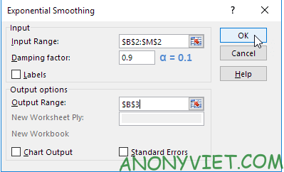 Trong hộp thoại, chọn Input Range và nhập phạm vi dữ liệu. Nhập hệ số làm mịn (damping factor) và chọn Output Range để xuất kết quả.