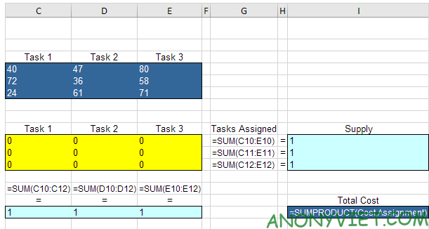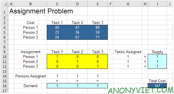 Ví dụ, nếu bạn chỉ định Người 1 cho Nhiệm vụ 1 và Người 2 cho Nhiệm vụ 2, tổng chi phí có thể được tính toán và đánh giá.