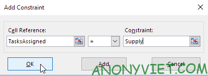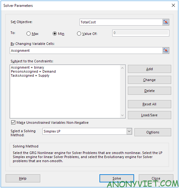 Chúng ta sẽ áp dụng Solver để phân công nhiệm vụ cho từng người nhằm giảm thiểu tổng chi phí.