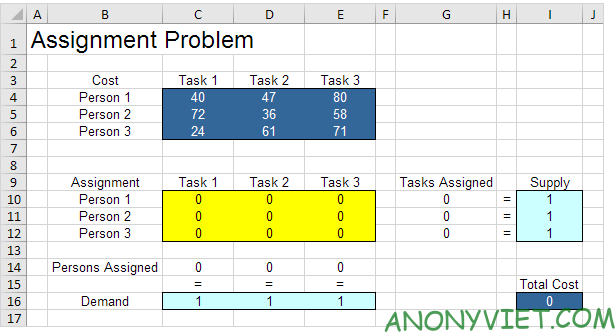 Chúng ta sẽ áp dụng Solver để phân công nhiệm vụ cho từng người nhằm giảm thiểu tổng chi phí.