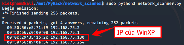 Sau khi cấu hình gói tin, bạn có thể sử dụng hàm srp() trong Scapy để gửi và nhận các gói tin. Hàm này sẽ trả về danh sách các phản hồi và không phản hồi từ các thiết bị trong mạng.