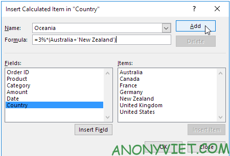 - Chọn Calculated Item và nhập tên cùng công thức (ví dụ: