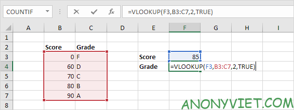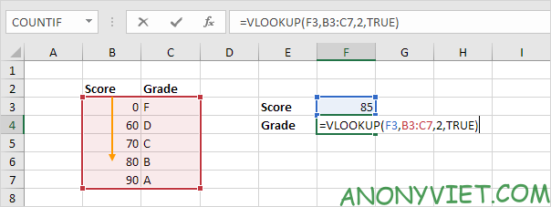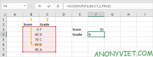 - range_lookup: TRUE để tìm gần đúng, FALSE để tìm chính xác.