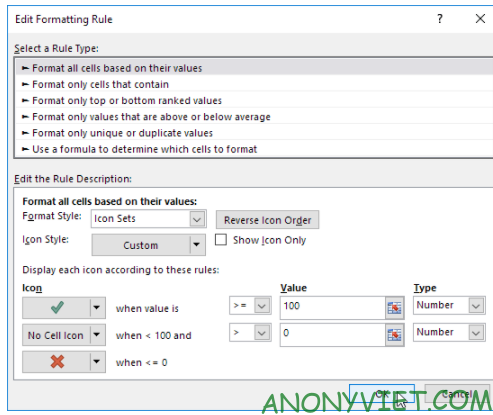 Bạn có thể tùy chỉnh các thuộc tính của Icon Sets để phù hợp với dữ liệu cụ thể: