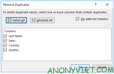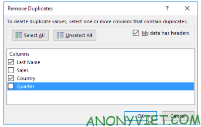 Để xóa các hàng có cùng giá trị trong một số cột nhất định, bạn cần bỏ chọn các cột không muốn kiểm tra trùng lặp. Nhấn OK để hoàn tất.