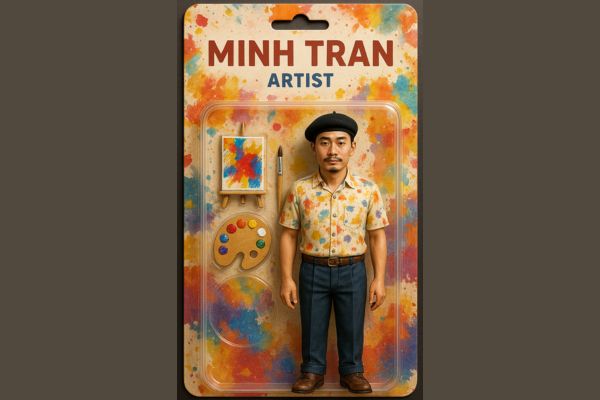 Ví dụ 1: Một figure nam nghệ sĩ với tên ‘MINH TRAN’, mặc áo sơ mi họa tiết, quần ống suông, và đi giày da. Phụ kiện đi kèm gồm cọ vẽ, bảng màu và tranh trừu tượng. Hộp có nền màu sắc trừu tượng.