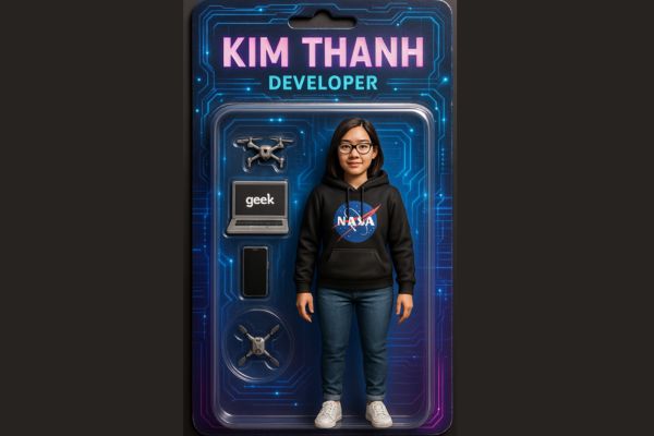 Ví dụ 2: Một figure nữ lập trình viên tên ‘KIM THANH’, mặc hoodie NASA, quần jeans và sneakers. Phụ kiện gồm laptop, điện thoại và drone nhỏ. Hộp mang phong cách cyberpunk.