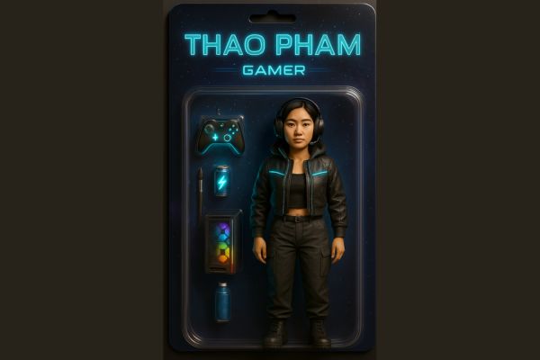 Ví dụ 3: Một figure nữ game thủ tên ‘THAO PHAM’, mặc tai nghe gaming, áo khoác LED và quần cargo. Phụ kiện gồm tay cầm chơi game, PC mini và lon nước tăng lực. Thiết kế hộp theo phong cách sci-fi.