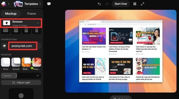 Công cụ này cho phép bạn thêm khung trình duyệt vào ảnh, giúp mô phỏng giao diện website chân thực hơn. Các tùy chọn như thanh địa chỉ, nút điều khiển và URL tùy chỉnh sẽ làm sản phẩm của bạn trông chuyên nghiệp hơn.