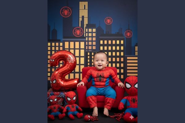 2. Biến hình SpiderMan: Bé diện bộ đồ siêu anh hùng SpiderMan và tạo dáng vui vẻ với các phụ kiện chủ đề.