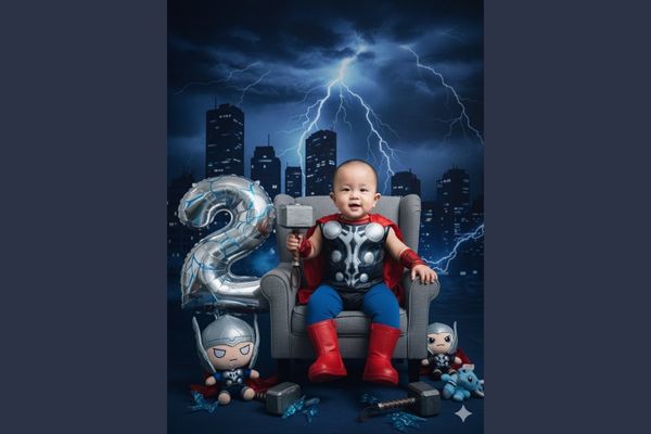 3. Thần Sấm Thor: Với áo giáp, búa thần, và cảnh nền bão tố, bé sẽ hóa thân thành Thor mạnh mẽ.