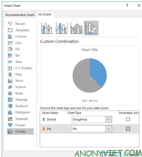 Sử dụng chức năng Create Custom Combo Chart để kết hợp biểu đồ Pie chartDoughnut chart. Các bước chi tiết đã được trình bày trong bài viết.