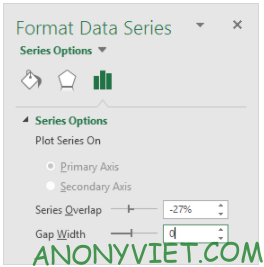 5. Nhấp chuột phải vào thanh màu xanh lam, chọn Format Data Series, sau đó thay đổi Gap Width thành 0%.