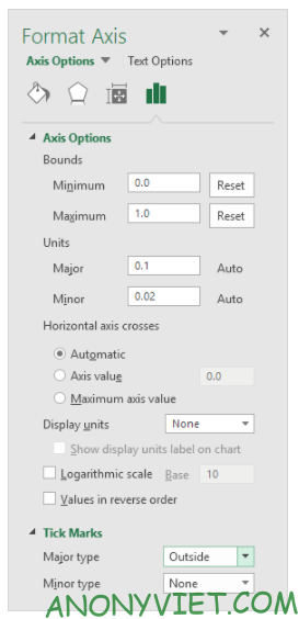 Nhấp chuột phải vào các số trên trục dọc, chọn Format Axis, sau đó điều chỉnh Minimum bound và Maximum bound theo ý muốn. Đừng quên đặt Major tick thành Outside.