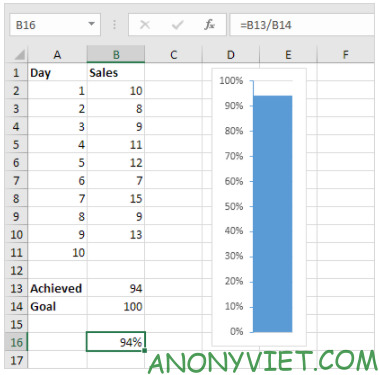 Biểu đồ nhiệt kế là một dạng biểu đồ cột trong Excel, thường được sử dụng để biểu diễn tiến độ hoặc tỷ lệ phần trăm hoàn thành của một mục tiêu. Bạn có thể xem thêm tại Tin tức 360.