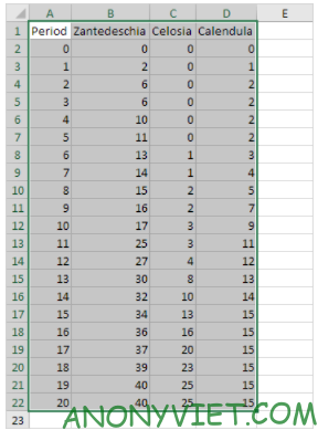 Bước 1: Chọn phạm vi dữ liệu (ví dụ: A1:D22).