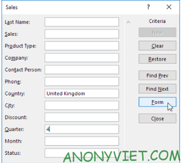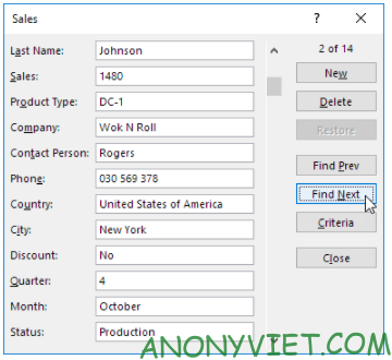 Nhấn nút Criteria trong Data Form và nhập tiêu chí tìm kiếm của bạn. Sử dụng các nút Find Prev và Find Next để duyệt qua các bản ghi khớp với tiêu chí.