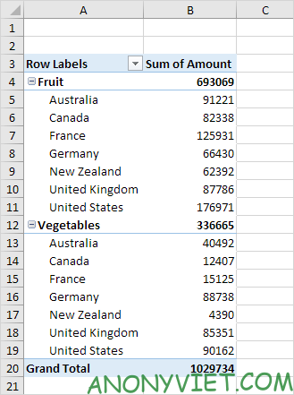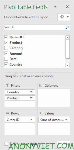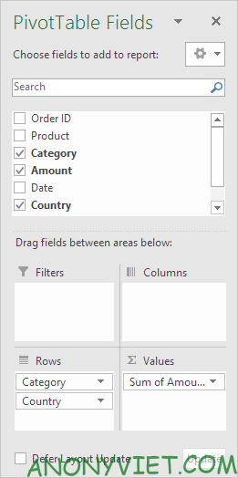 • Trường Category và Country vào khu vực Rows.
