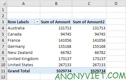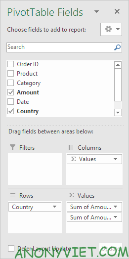 • Trường Amount cho vùng Values (2 lần).