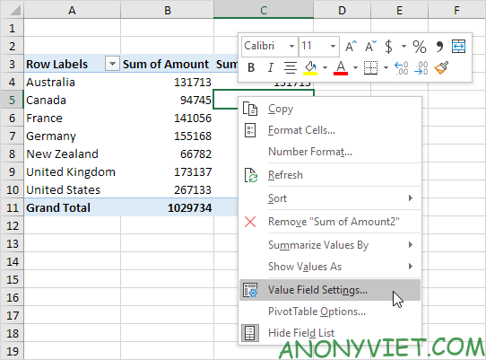 Khi bạn kéo trường Amount lần thứ hai, Excel sẽ tự động điền vào vùng Columns. Sau đó, bạn có thể tùy chỉnh giá trị hiển thị.