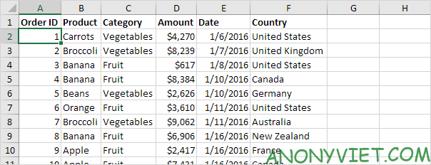 Tập dữ liệu của chúng ta bao gồm 213 bản ghi với 6 trường: Order ID, Product, Category, Amount, Date và Country.
