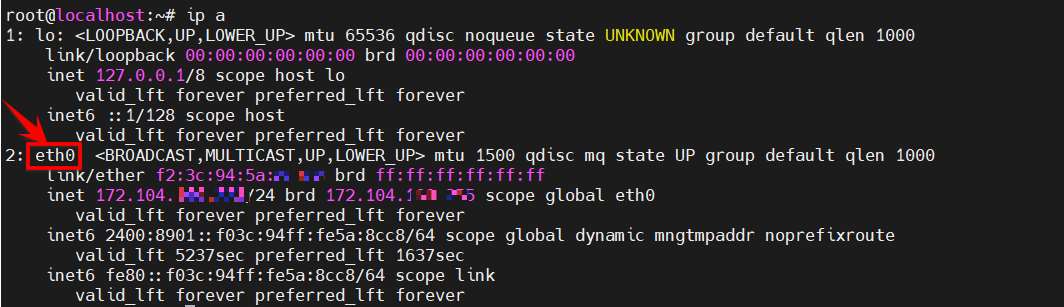 • Bước 2: Kiểm tra tên card mạng của VPS bằng lệnh: ip a. Ghi lại tên interface, ví dụ: eth0.