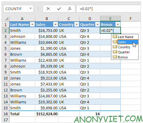 • Chọn ô E2 và nhập ‘=0.02*[‘. Danh sách các tham chiếu có cấu trúc sẽ hiển thị.